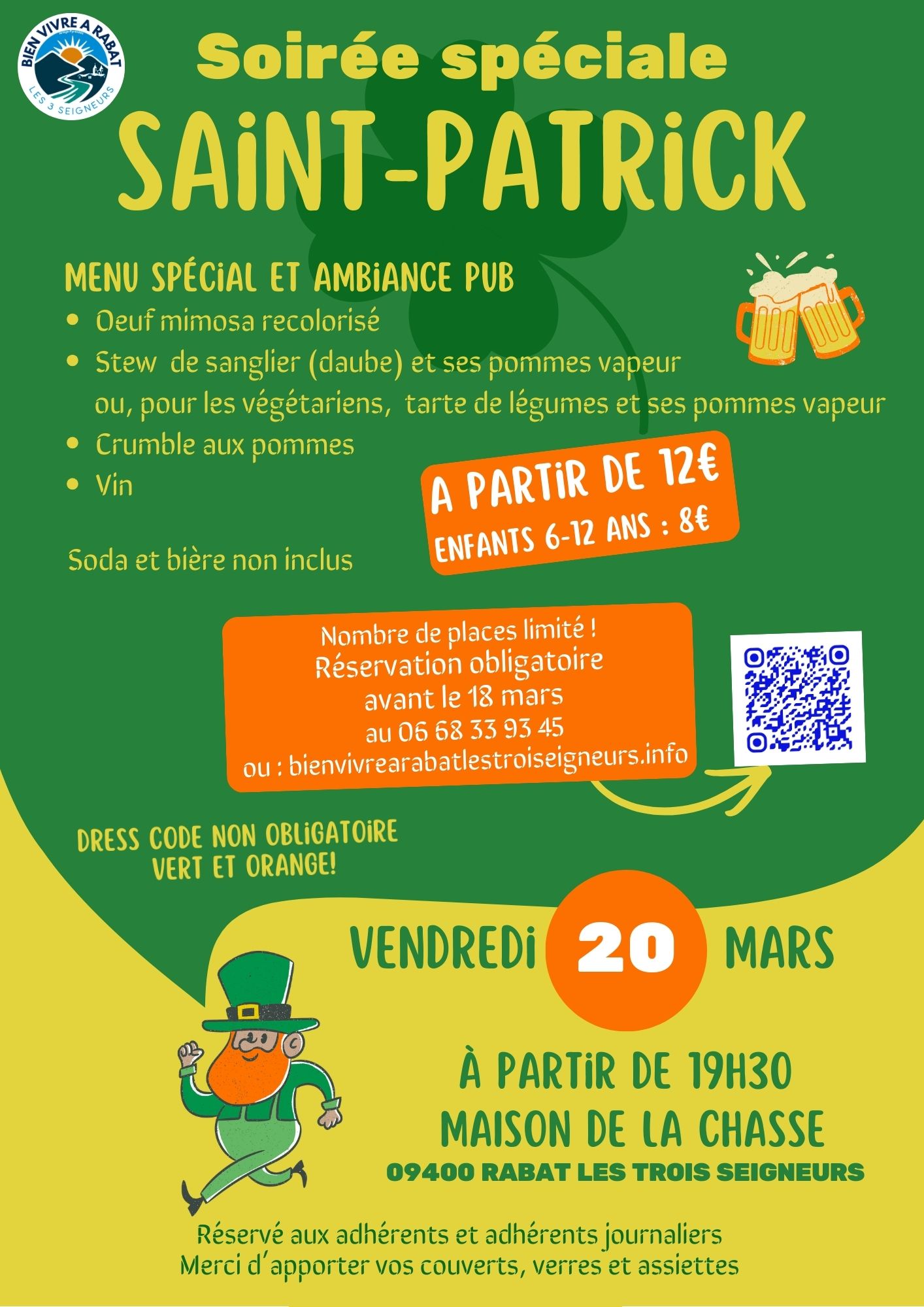 Un menu directement inspiré par l’Irlande ! Bienvenue à la maison de la chasse à Rabat pour une soirée haute en couleur et en partage ! Réservé aux adhérents